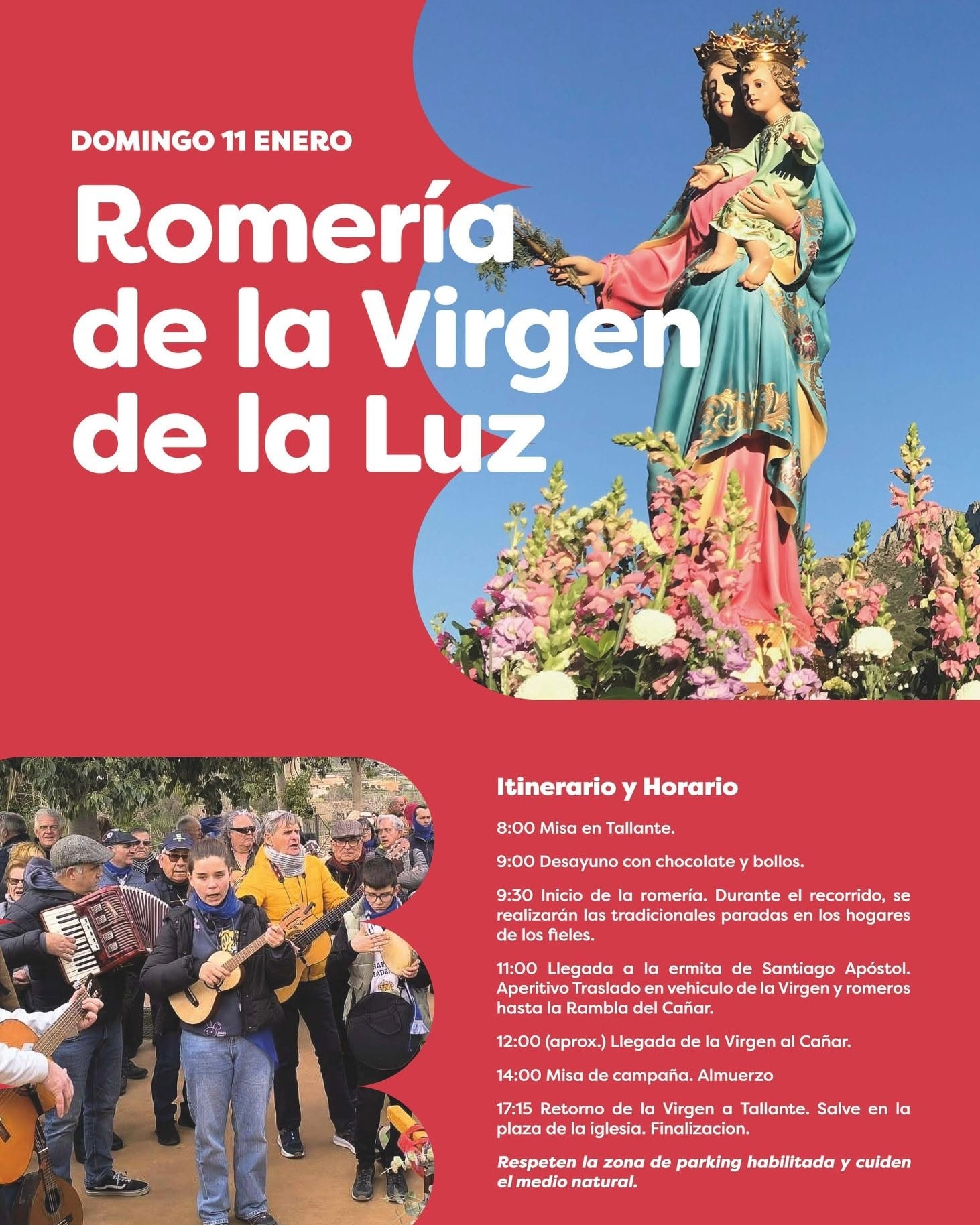 Romería de la Virgen de la Luz en El Cañar (Tallante), a partir de las 8:00 horas. La jornada arrancará con una misa en la parroquia de San Antonio de Padua de Tallante. Después, se ofrecerá un desayuno de chocolate con bollos y ya a las 9:30 se iniciará la romería, durante el recorrido se realizarán las tradicionales paradas en los hogares de los fieles. A las 11:00 horas, está previsto la llegada a la ermita de Santiago Apostol y a las 12:00 horas a la virgen al Cañar. Ya a las 17:15 horas se producirá el regreso de la virgen a Tallante. Más detalles en el cartel adjunto a esta noticia.