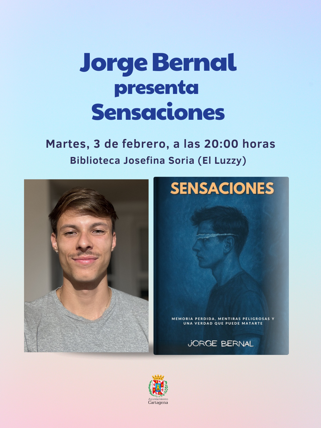 La programación literaria del Ayuntamiento de Cartagena recibe este martes 3 de febrero, a las 20:00 horas, al autor cartagenero Jorge Bernal, que presentará su obra Sensaciones. El acto se realizará en la biblioteca Josefina Soria del Centro Cultural Ramón Alonso Luzzy y la entrada es libre, hasta completar aforo.