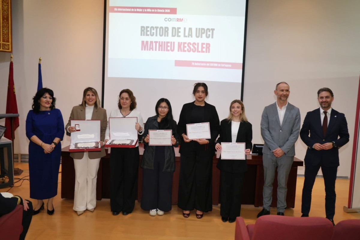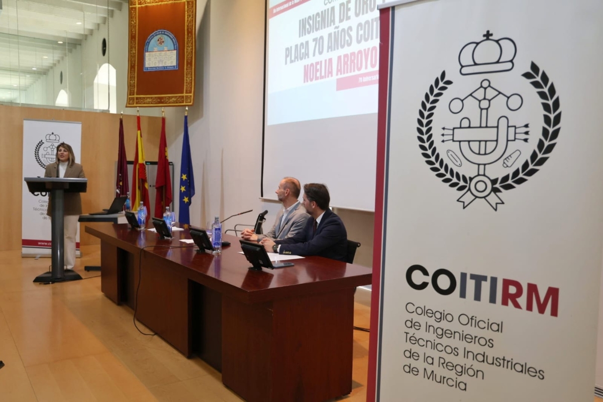 La alcaldesa de Cartagena, Noelia Arroyo, ha recibido esta mañana la Insignia de Oro y la Placa conmemorativa del 70 aniversario del Colegio Oficial de Ingenieros Técnicos Industriales de la Región de Murcia (COITIRM), en un acto celebrado en el Salón de Grados de la Escuela Técnica Superior de Ingeniería Industrial de la UPCT, enmarcado en la conmemoración del Día Internacional de la Mujer y la Niña en la Ciencia.