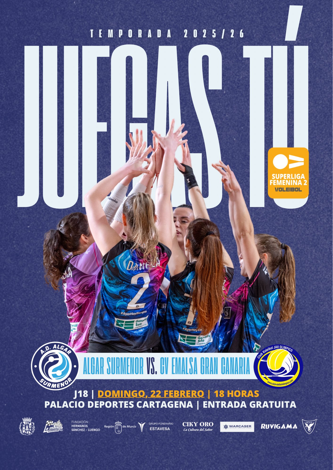Voleibol. Algar Surmenor - CV Emalsa Gran Canaria, a las 18:00 horas, en el Palacio de Deportes de Cartagena. El conjunto local buscará salir de la zona de descenso en este encuentro contra el equipo canario. La entrada es libre.