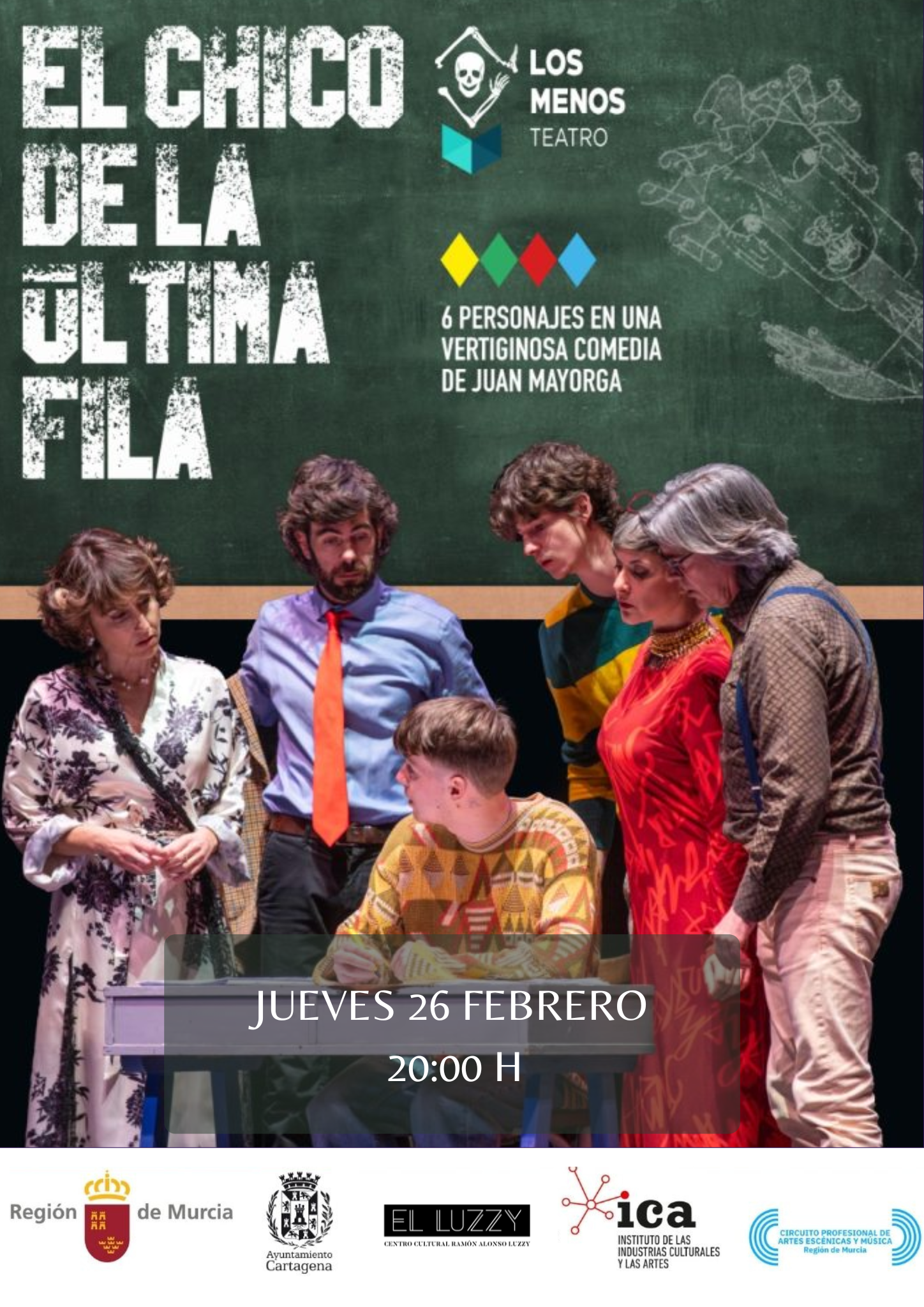 El Ayuntamiento de Cartagena continúa con la programación teatral del Centro Cultural Ramón Alonso Luzzy para el primer trimestre de año. Este jueves 26 de febrero será el turno de la comedia El chico de la última fila, una divertida propuesta de Los Menos Teatro. La representación arrancará a las 20:00 horas en el salón de actos del Centro Cultural Ramón Alonso Luzzy. Más información y venta de entradas disponible en la web www.cultura.cartagena.es; así como en la taquilla del espacio cultural (miércoles, de 10 a 14 horas, solo pago con tarjeta, y antes de la representación).