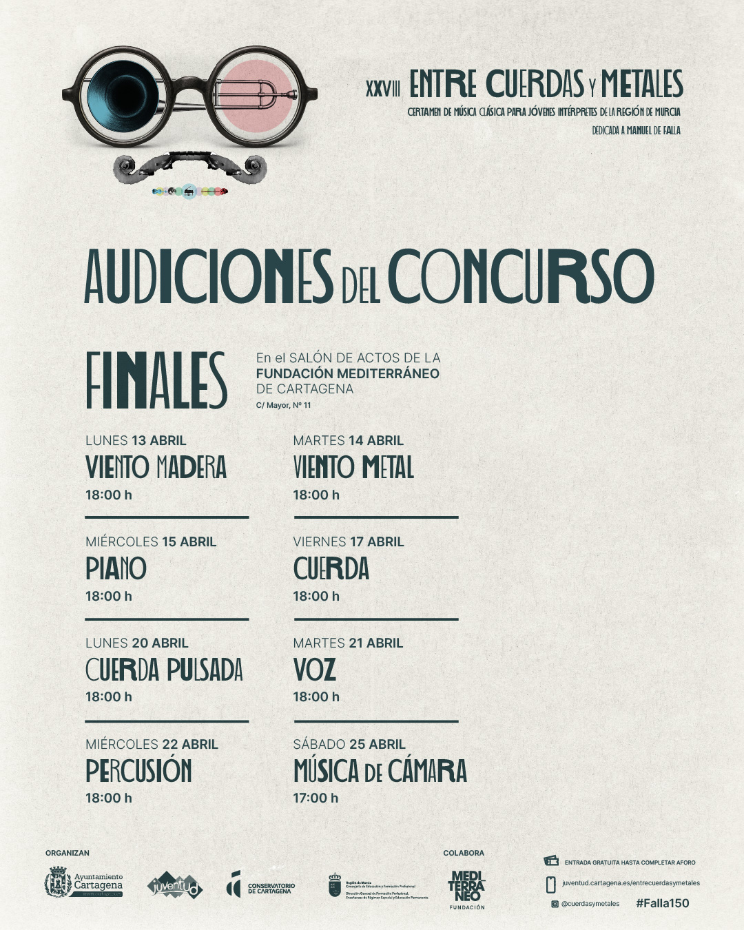 Las Finales se celebrarán en el Salón de Actos de la Fundación Mediterráneo de Cartagena (C/ Mayor, Nº 11), con entrada libre hasta completar aforo. Estas citas suponen no solo la culminación del proceso competitivo, sino también una auténtica muestra pública de excelencia musical joven en la Región.