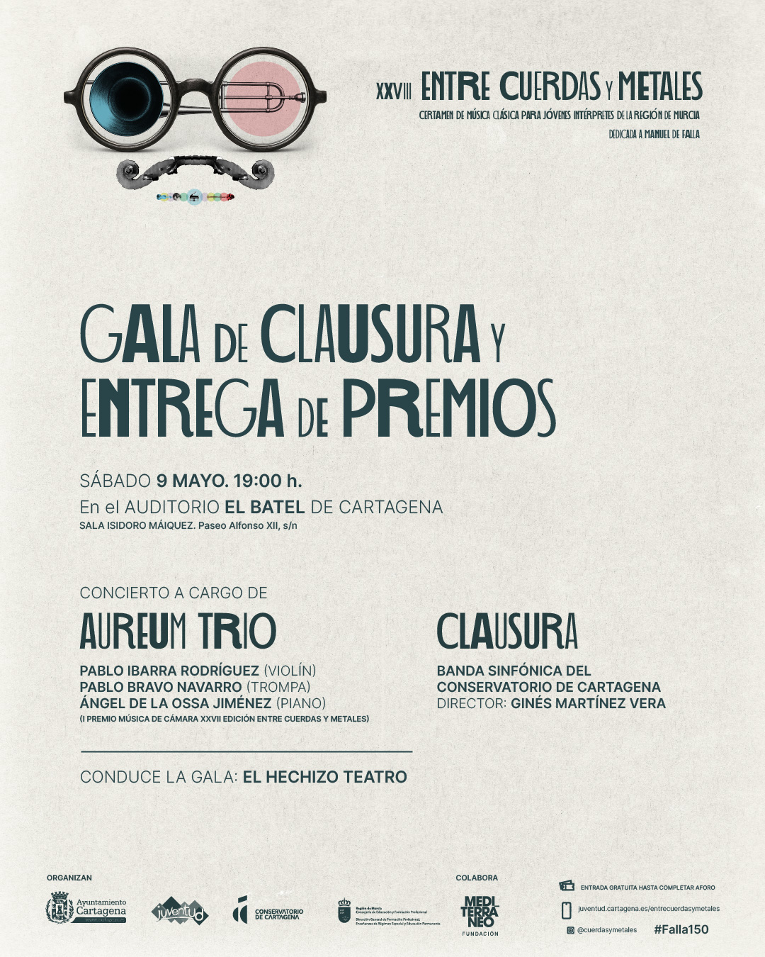 La gala contará con la actuación del grupo ganador de Música de Cámara de la edición anterior, Aureum Trio, formado por Pablo Ibarra (violín), Pablo Bravo (trompa) y Ángel de la Ossa (piano). El concierto concluirá con la actuación de la Banda Sinfónica del Conservatorio de Cartagena, bajo la dirección de Ginés Martínez Vera.