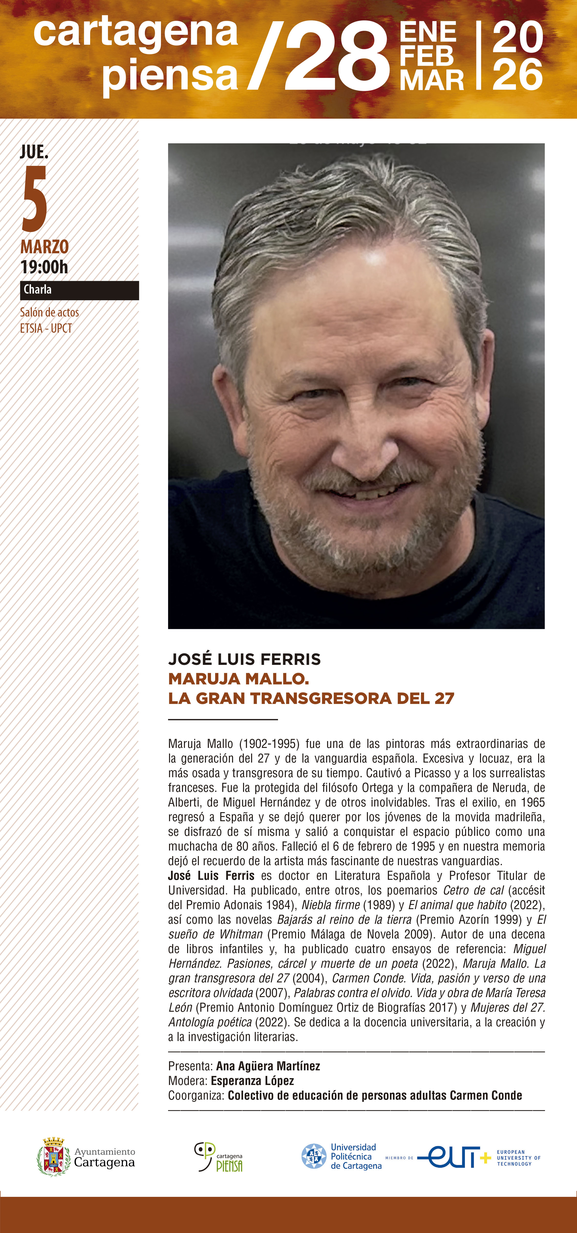 Cartagena Piensa, el programa que sostiene el Ayuntamiento, en colaboración con la UPCT y que desarrolla y programa el grupo promotor, analiza este jueves 5 de marzo la figura de Maruja Mallo, pintora de la generación del 27. Se trata de una conferencia impartida por el profesor y escritor José Luis Ferris, a las 19:00 horas, en la Escuela Técnica Superior de Ingenieros Agrónomos (UPCT), con entrada libre, hasta completar aforo.