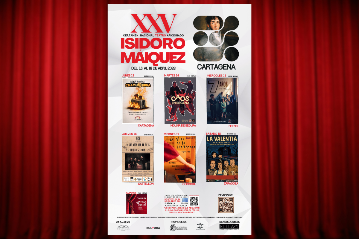 El Certamen Nacional de Teatro Aficionado Isidoro Máiquez, organizado por la Asociación Cultural Algameca y el Ayuntamiento de Cartagena, ha dado a conocer las obras finalistas de su XXV edición, que se celebrará del 13 al 18 de abril en el salón de actos del Centro Cultural Ramón Alonso Luzzy. Las entradas se pondrán a la venta este viernes 13 de marzo en la web www.cultura.cartagena.es, así como en la taquilla del espacio cultural (miércoles de 10 a 14 horas y antes de cada representación. Pago solo con tarjeta).