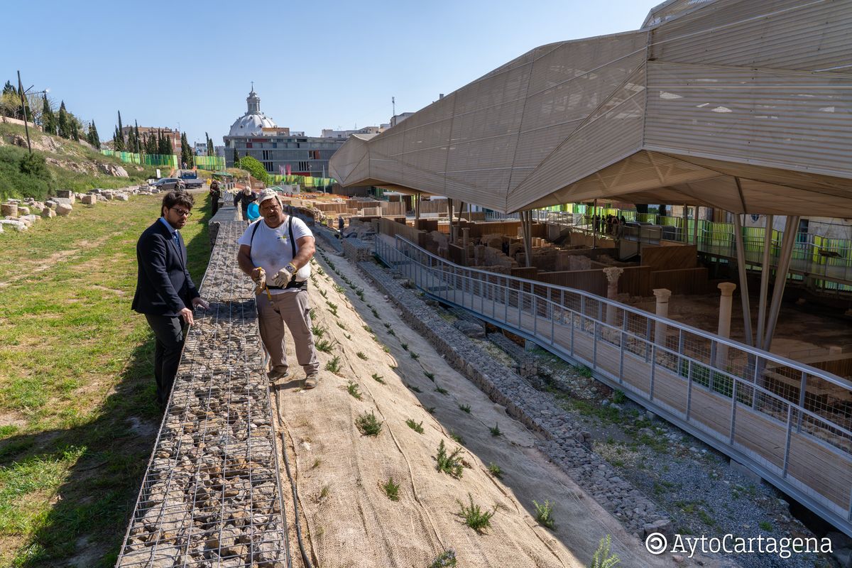 “Estamos plantando esparto, una vegetación autóctona que da nombre a la zona (Espartaria) y que apenas requiere riego, lo cual es una ventaja evidente”, ha detallado la profesora. Además, para proteger el terreno, se ha empleado malla de yute, “visualmente más acorde con el entorno histórico, no deja residuos plásticos y, al degradarse en un año o año y medio, no deja rastro, evitando además el crecimiento de malas hierbas en esta zona de solana”.