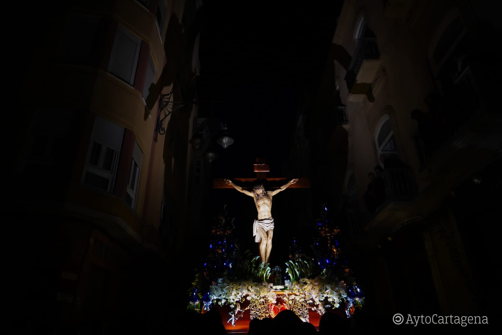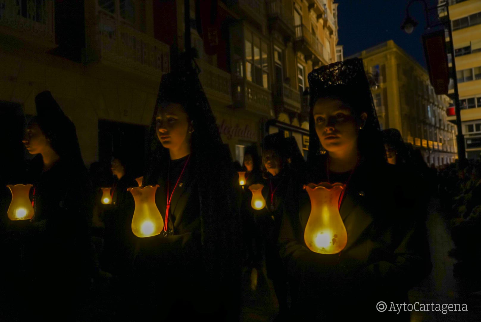 La alcaldesa de Cartagena, Noelia Arroyo, ha acompañado este jueves, 2 de abril, a Su Majestad la Reina Sofía, junto a Sus Altezas Reales las infantas Doña Elena y Doña Cristina, para presenciar la Procesión Solemne del Silencio y del Santísimo Cristo de los Mineros, de la Cofradía California. Han seguido el cortejo desde los balcones de la Real Sociedad Económica de Amigos del País, en la Calle del Aire, coincidiendo con la salida de la comitiva desde la Iglesia de Santa María de Gracia. Como es habitual, las luces de la ciudad se han apagado al paso de este cortejo.
