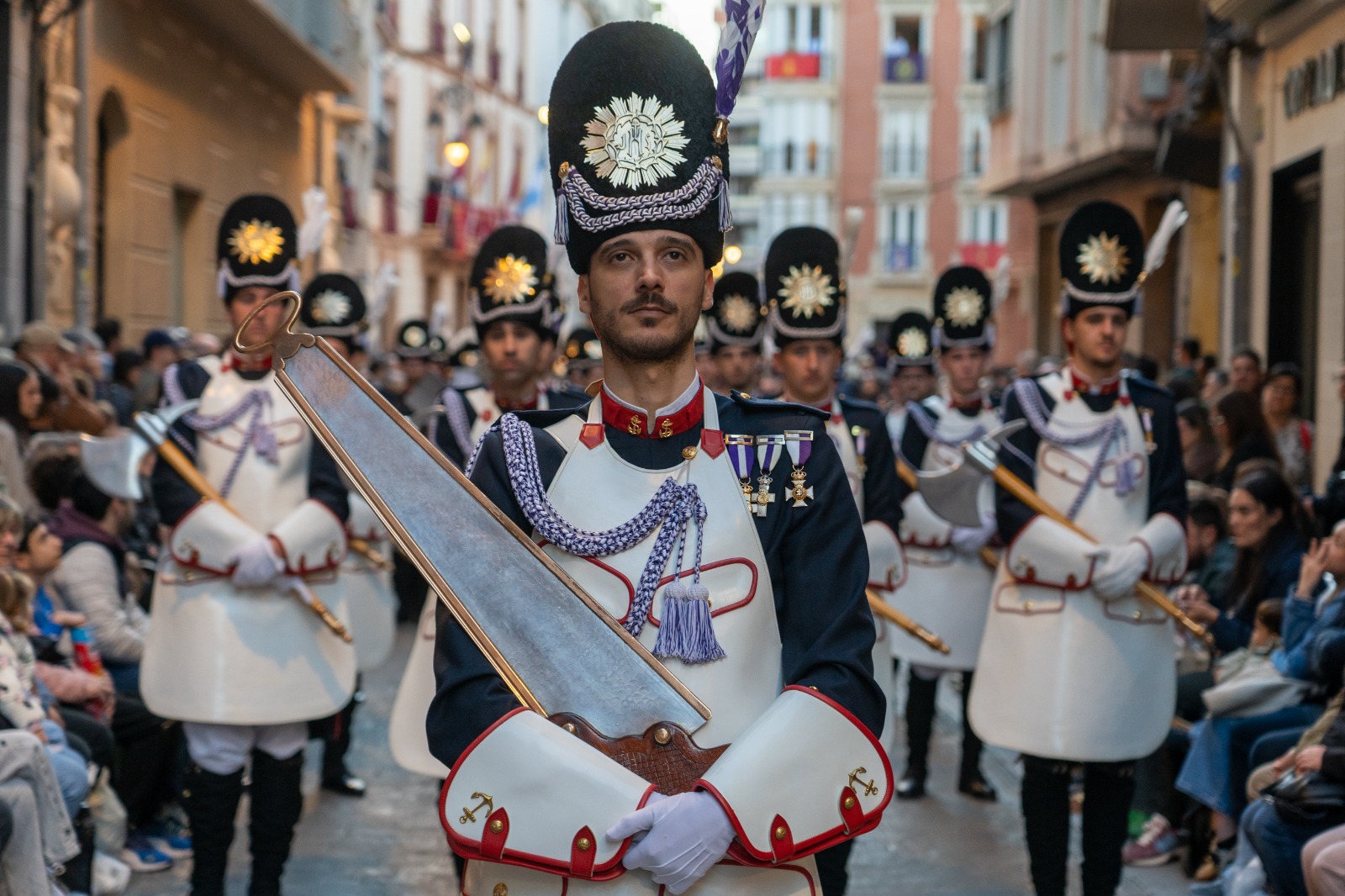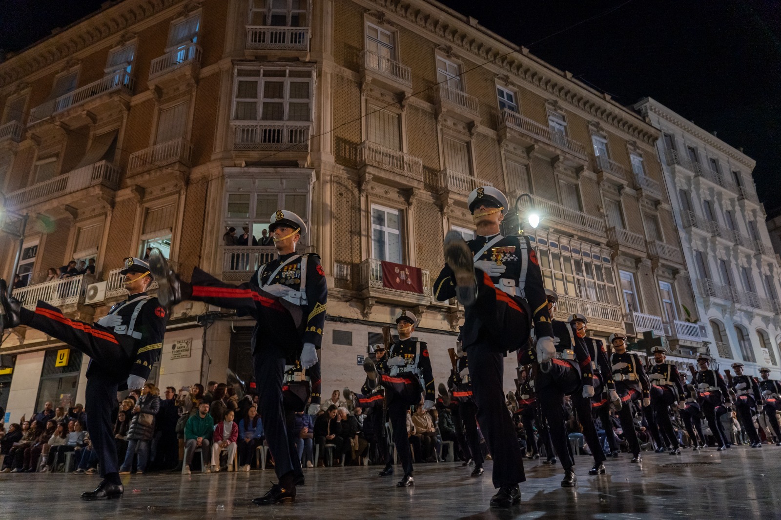 El cierre del cortejo corrió a cargo del piquete del Tercio de Levante de Infantería de Marina de la Armada Española, cuya característica forma de desfilar volvió a deslumbrar a cartageneros y foráneos que se congregaron a lo largo del recorrido que transitó por el casco histórico de la ciudad.
