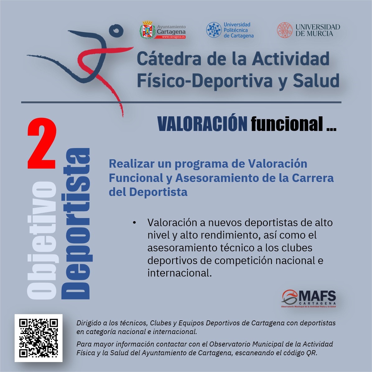 La Cátedra de la Actividad Físico-Deportiva y la Salud, que mantiene el Ayuntamiento de Cartagena con la UPCT y la Universidad de Murcia, tiene entre sus objetivos estratégicos la “Valoración funcional y asesoramiento a la carrera del deportista”. Con este propósito se impulsa al rendimiento deportivo en el municipio a través de la ciencia.