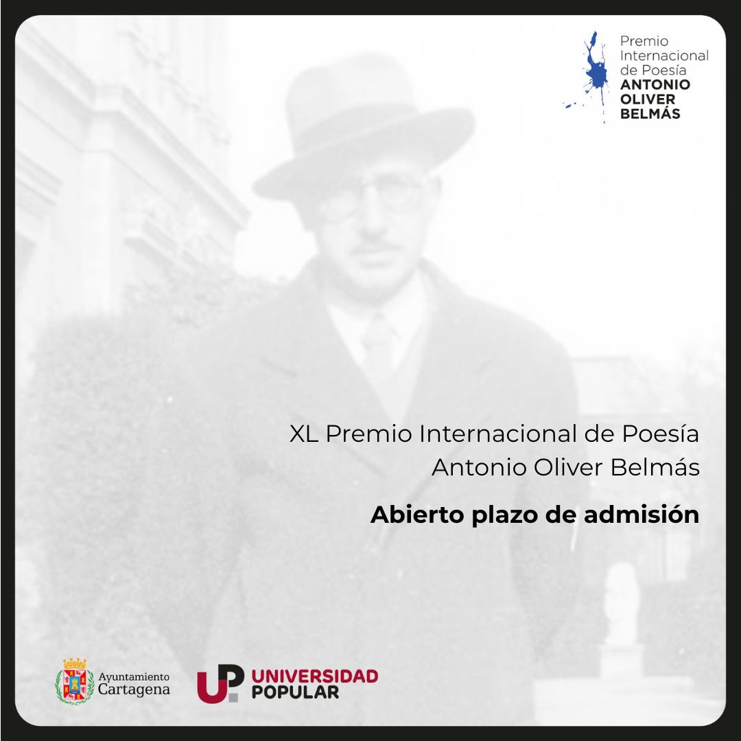 El Ayuntamiento de Cartagena, a través de la Universidad Popular ha convocado la XL edición del Premio Internacional de Poesía Antonio Oliver Belmás. Según las bases del certamen, adjuntas a esta noticia y aprobadas el pasado 19 de febrero por la Junta de Gobierno Local, los interesados pueden presentar sus propuestas hasta el próximo 17 de julio. Más información en www.up.cartagena.es