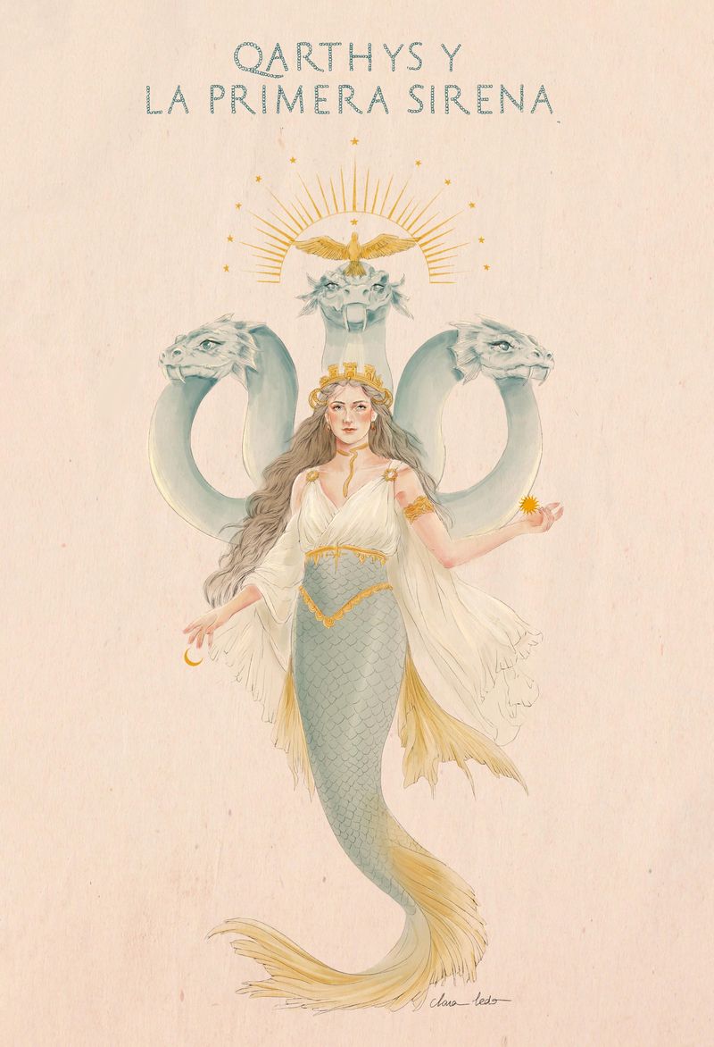 En un segundo plano, Qarthys, un guardián del mar con formas suaves y curvas en tonos apagados, envuelve a la sirena en una atmósfera tranquila y casi sagrada. La paleta armónica, dominada por tonos pastel y acentos dorados aportan calidez y sofisticación.