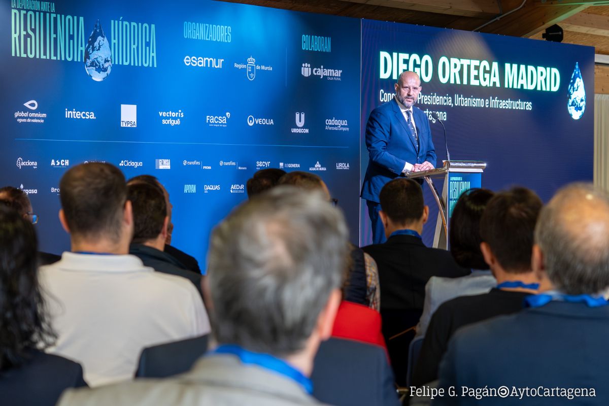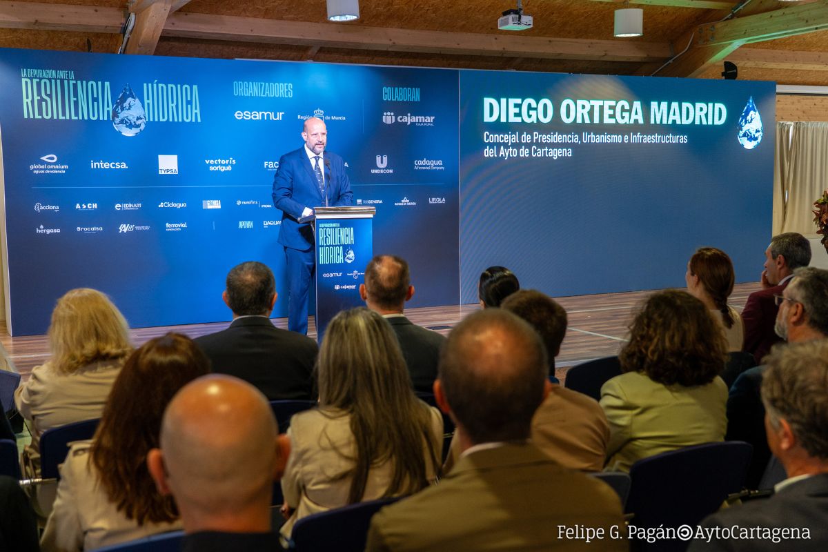 Cartagena ha ratificado su liderazgo en materia de reutilización de agua y eficiencia energética en las jornadas ‘La depuración ante la resiliencia hídrica: Autosuficiencia Energética en el Cambio Climático’ que este miércoles ha acogido la Sala Isaac Peral de la Universidad Politécnica de Cartagena. El concejal de Presidencia, Infraestructuras y Urbanismo, Diego Ortega, ha participado en la apertura de este foro de innovación junto a la consejera de Agua, Agricultura, Ganadería y Pesca, Sara Rubira, explicando que el municipio es un referente internacional al reutilizar el 98% de sus aguas.
